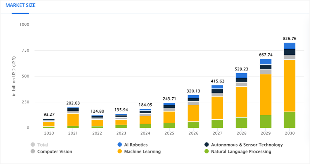 - The AI market size is estimated to reach $184 billion in 2024 and is expected to grow at a CAGR of 28.46% to reach $826.76 billion by 2030.