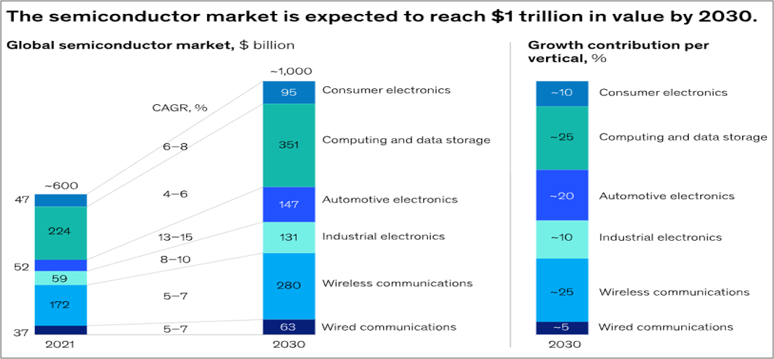 - The global semiconductor market is poised to double from $600 billion in 2021 to $1 trillion by 2030, according to McKinsey & Company.