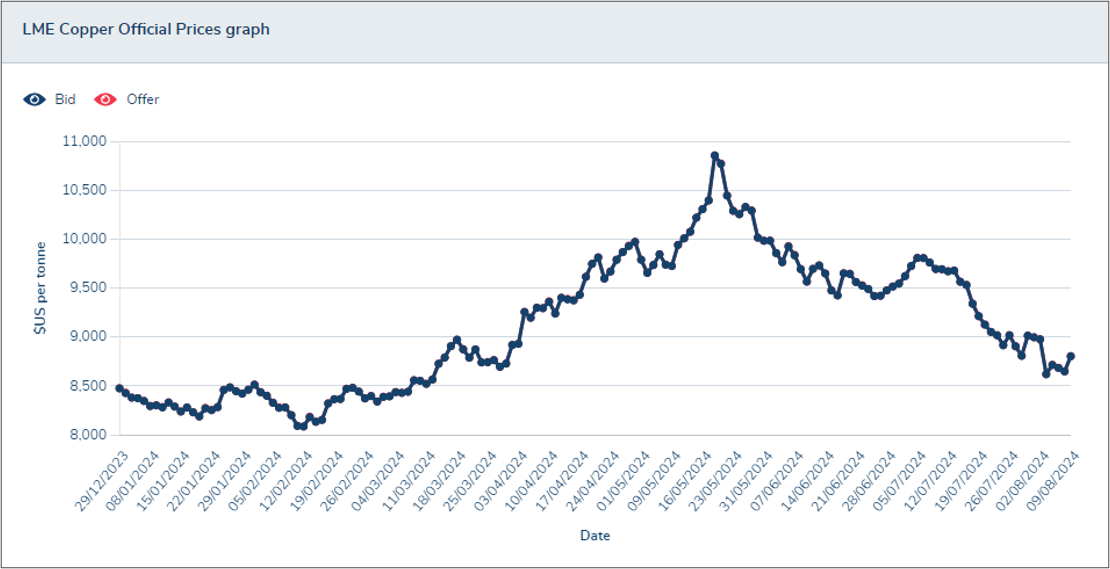 - Copper prices have stabilized after surging past USD$10,000 previously and remain below USD$9,000.